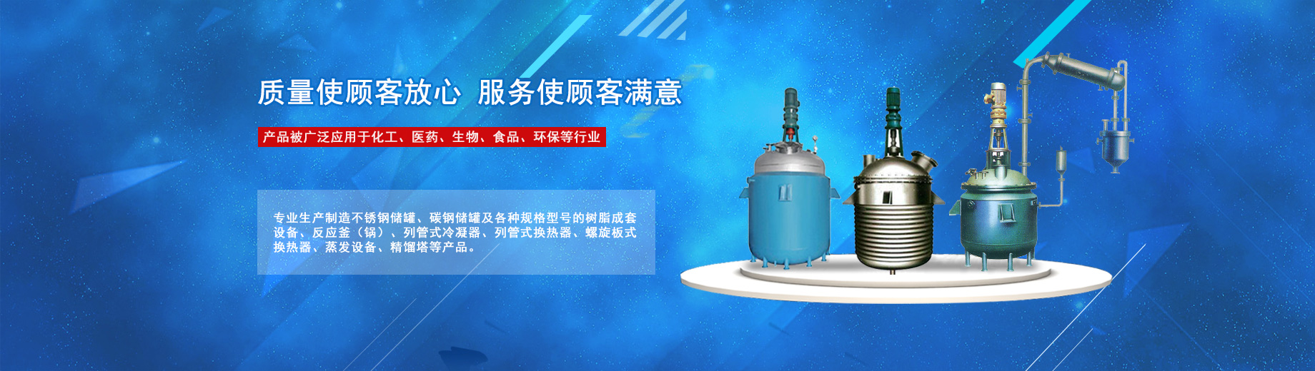公司專業(yè)生產制造不銹鋼儲罐、碳鋼儲罐及各種規(guī)格型號的樹脂成套設備、反應釜(鍋)、列管式冷凝器、列管式換熱器、螺旋板式換熱器、蒸發(fā)設備、精餾塔等產品,被廣泛應用于化工、醫(yī)藥、生物、食品、環(huán)保等行業(yè)。